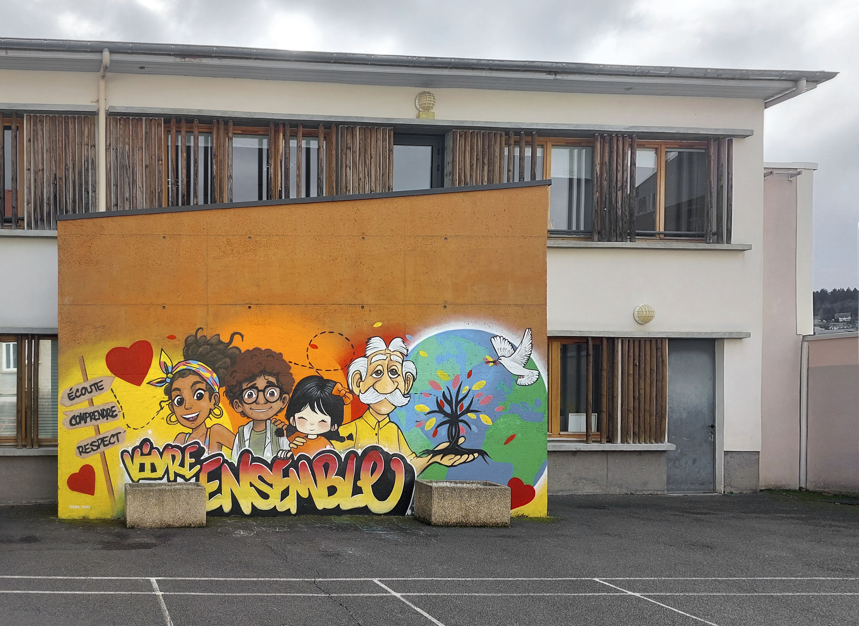 Sur cette fresque, quatre personnages, d’origines et d’âges différents, sont peinturlurés, symbolisant l’harmonie entre les générations et les cultures. Un lettrage de type graffiti “Vivre Ensemble” est inscris au bas de cette réalisation, un rappel visuel fort de l’intention de l’œuvre. Ce mur n’est pas seulement le produit de l’imagination de Sare Decor, mais également une véritable création collective. Elle a été peinte et imaginée en collaboration avec des jeunes de la Maison de Quartier, des habitants désireux de s’essayer à l’art du graff, ainsi qu’une association dédiée à l’aide des jeunes en difficulté.