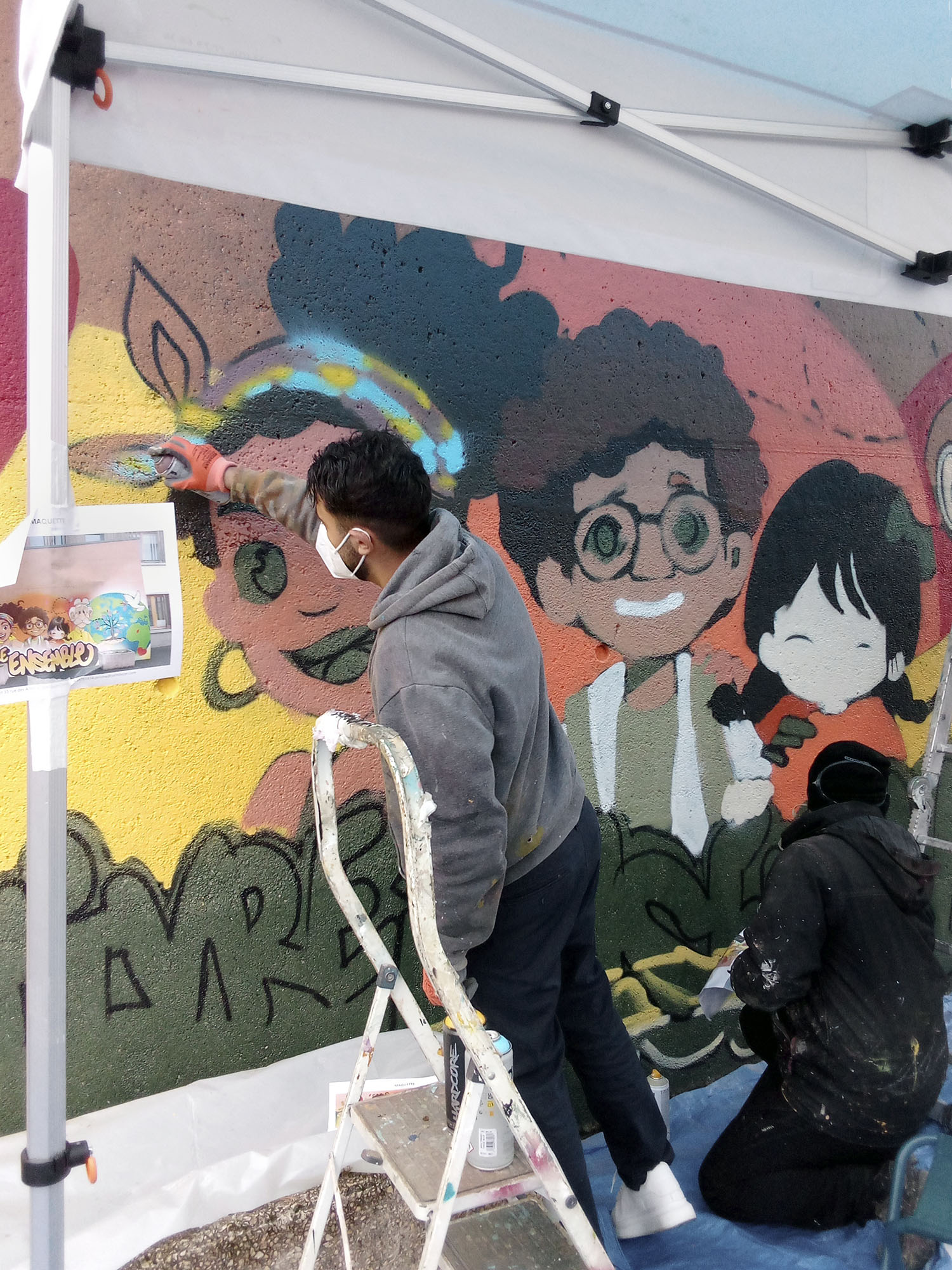 Les couleurs vives utilisées par l’artiste enveloppent la fresque d’une atmosphère joyeuse et optimiste. On y trouve aussi une colombe, symbole universel de paix, aux côtés de la planète Terre, rappelant l’importance de la solidarité et de la coexistence. Cette fresque est ainsi devenue symbole pour la maison de quartier, un lieu où l’échange et la puissance des idées se rencontrent dans une atmosphère de respect et de sourires. À travers cette initiative, Sare Decor a non seulement embelli un mur, mais a aussi renforcé le message social de ce quartier, invitant chacun à s’engager dans la construction d’une société plus inclusive.
